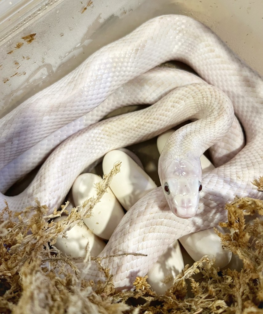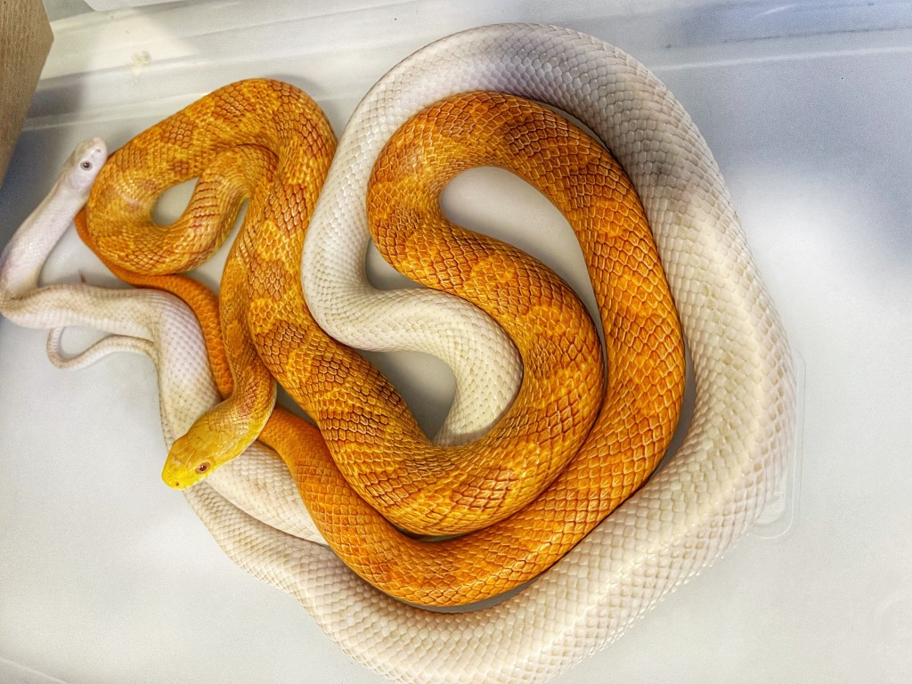 Miskimmon line orange albino black rat (Pantherophis alleghaniensis) x rusty white sided pairing. The Miskimmon orange line of albino black rat snakes has been selectively bred by many years to produce albinos with bright/saturated orange adults. Truly amazing animals!