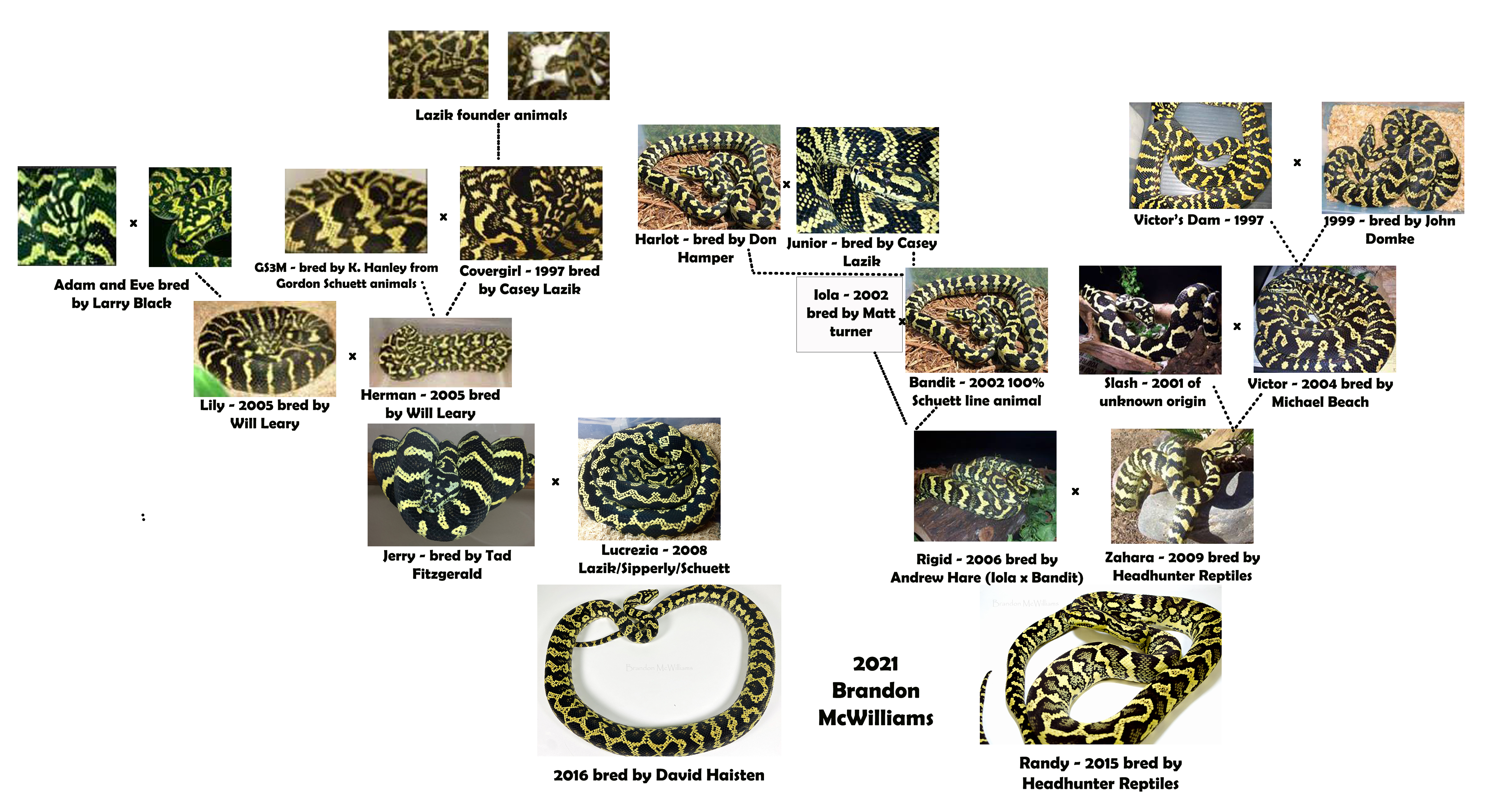 2016 Jerry x Lucrezia (David Haisten) female bred to 2019 Scattershot x Headhunter male I produced (Sylvia x Randy). This clutch has a diverse lineage (see chart) jam packed with old school jungle lines including Scattershot/Lazik/Sipperly/Schuett/ Larry Black/ Leary/Hare/Covergirl. Only got 2 good eggs and some slugs.